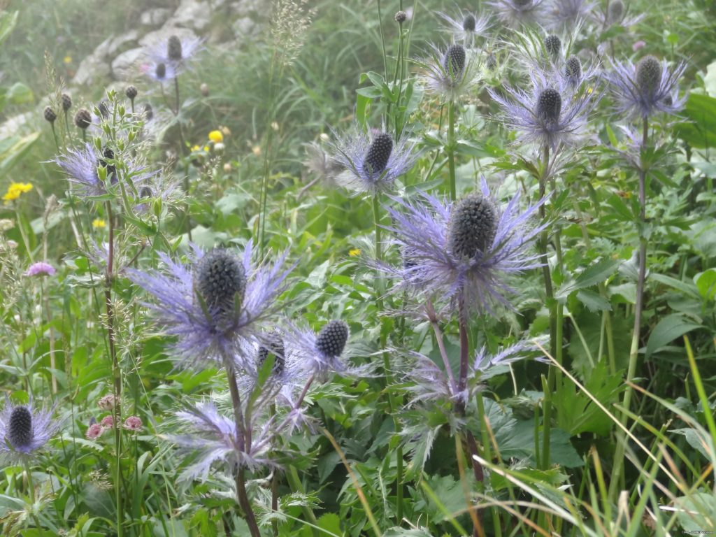 Avec ses petites fleurs blanches entourées par des bractées bleu violacé, vous n’aurez aucun problème à identifier ce faux chardon !