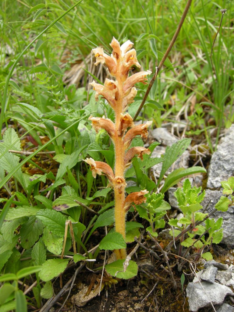 Vous ne trouverez pas une seule touche de vert sur cette plante, et pour cause, elle n’utilise pas de chlorophylle ! En effet, l’Orobanche de Bartling est une plante parasite, elle vit exclusivement sur le Séséli du Liban (Libanotis pyrenaica (L.) O. Schwarz).
