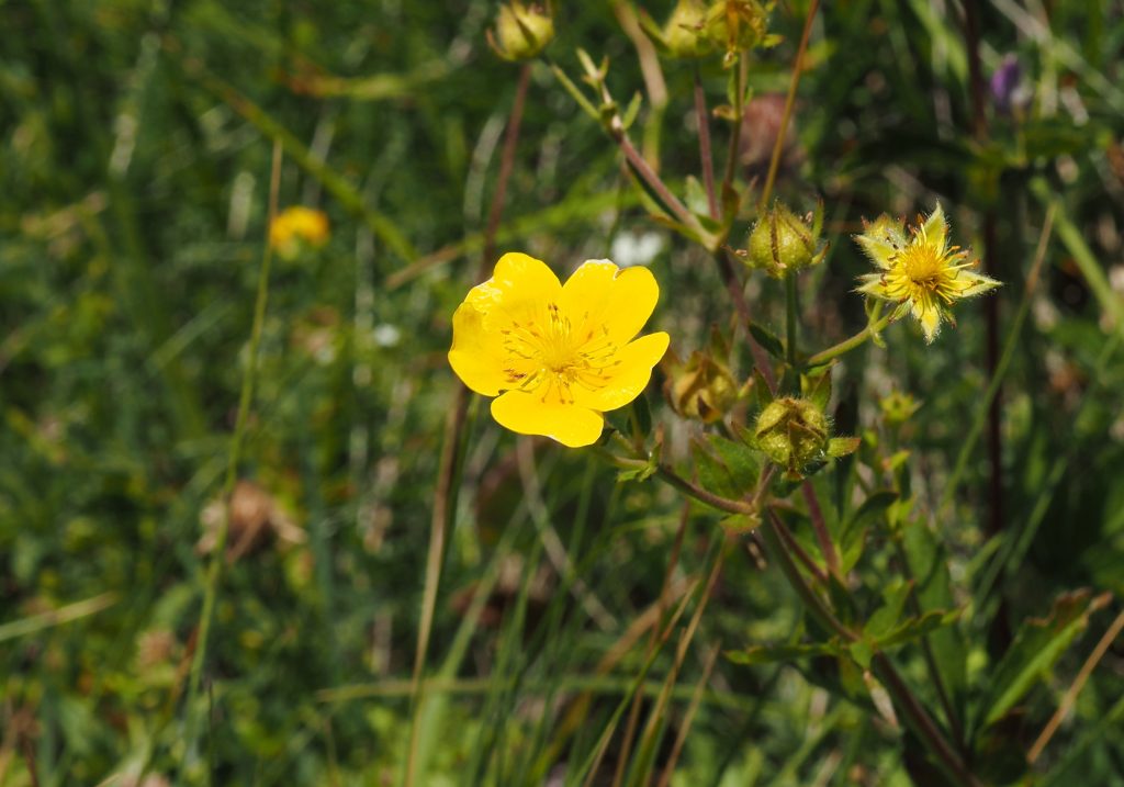 Tige dressée. Feuilles basales, longuement pétiolées, découpées jusqu’à l’axe en cinq folioles disposées comme les doigts de la main. Fleurs jaunes et grandes (2 – 3 cm de diamètre).