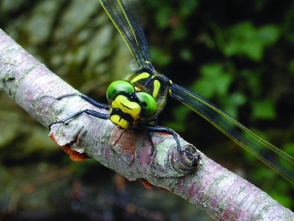 Cette grande libellule noire et jaune est facilement identifiable grâce à ses yeux verts qui se touchent en un seul point.