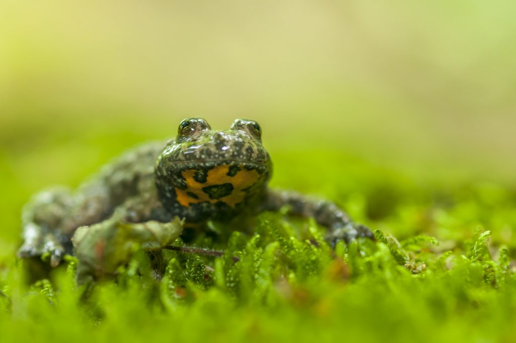 Ce petit crapaud tient son nom de la coloration jaune de son ventre ! Le motif formé par ses taches ventrales jaunes et noires est propre à chaque individu, à l’image de nos empreintes digitales. S’il se sent en danger, il se recourbe pour montrer les couleurs vives de son ventre afin d’effrayer les prédateurs : « Attention je suis toxique ! »