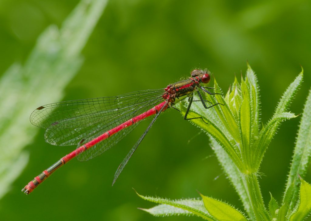 C’est le rouge vermillon de la Petite nymphe au corps de feu, qui attire le regard sur les feuilles vert tendre d’une ronce.